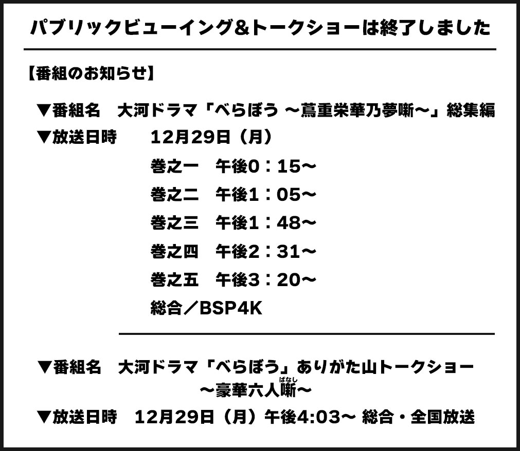 | お問合せ | 大河ドラマ「べらぼう」最終回PV&トークショー申込事務局 (受託者:株式会社パシフィックアートセンター)メールアドレス info@berabou-event2025.net |